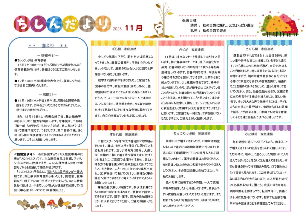 保育だより 11月 公開済み: 2025年10月31日更新: 2025年10月31日作成者: chishinカテゴリー: 保育スケジュール, 園だより 関連記事 保育だより 8月 公開済み: 2025年7月31日更新: 2025年7月31日作成者: chishinカテゴリー: 保育スケジュール, 園だより 保育だより 2月 公開済み: 2025年2月3日更新: 2025年2月3日作成者: chishinカテゴリー: 保育スケジュール, 園だより 保育だより 4月 公開済み: 2024年4月8日更新: 2024年4月8日作成者: chishinカテゴリー: 保育スケジュール, 園だより