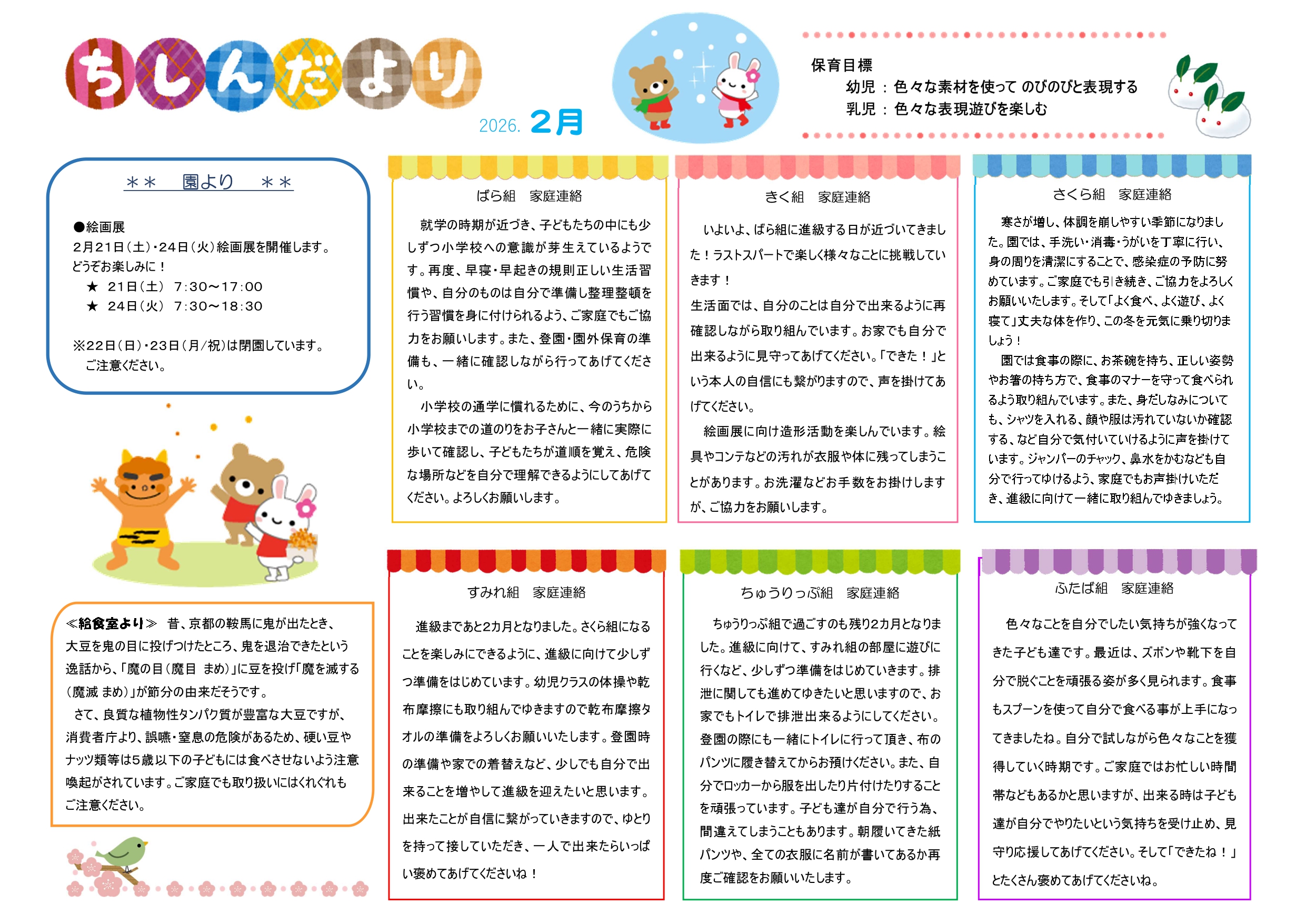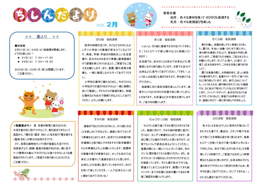 保育だより 2月 公開済み: 2026年1月30日更新: 2026年1月30日作成者: chishinカテゴリー: 保育スケジュール, 園だより 関連記事 保育だより 5月 公開済み: 2024年5月1日更新: 2024年5月1日作成者: chishinカテゴリー: 保育スケジュール, 園だより 保育だより 4月 公開済み: 2025年4月8日更新: 2025年4月8日作成者: chishinカテゴリー: 保育スケジュール, 園だより 保育だより 2月 公開済み: 2025年2月3日更新: 2025年2月3日作成者: chishinカテゴリー: 保育スケジュール, 園だより